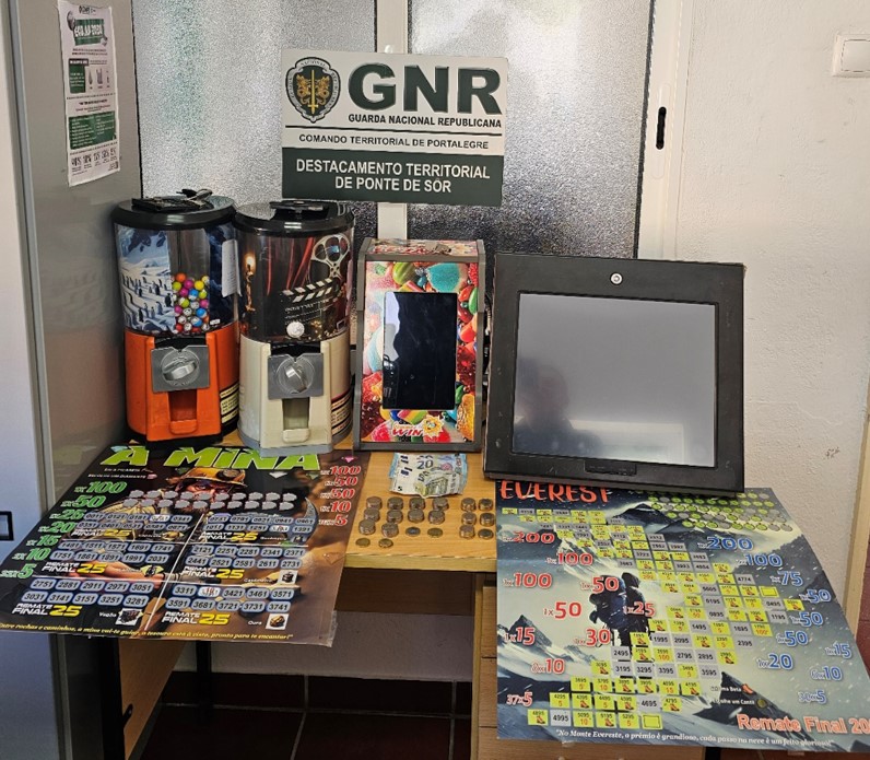 O Comando Territorial de Portalegre, através do Destacamento Territorial de Ponte de Sor, no dia 18 de novembro, apreendeu quatro máquinas de jogo ilegal e identificou dois homens, de 32 e 44 anos, por jogo ilegal, no concelho de Ponte de Sor.