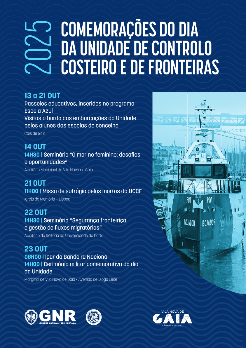 A Unidade de Controlo Costeiro e de Fronteiras comemora, no próximo dia 23 de outubro, o seu 17.º aniversário. Incluída nas comemorações desta data, terá lugar uma cerimónia militar no dia 23 de outubro, pelas 16H00, no Pavilhão Multiusos Nélson Mandela, em Vila Nova de Gaia.