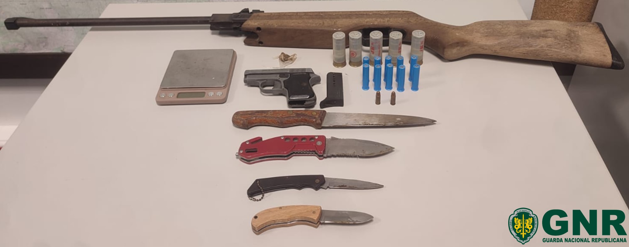O Comando Territorial de Santarém, através do Posto Territorial de Marinhais e do Núcleo de Investigação Criminal (NIC) de Coruche, no dia 9 de julho, apreendeu armas, munições e material furtado, a um homem de 36 anos, arguido num processo de violência doméstica e suspeito de furtos, na localidade de Marinhais.