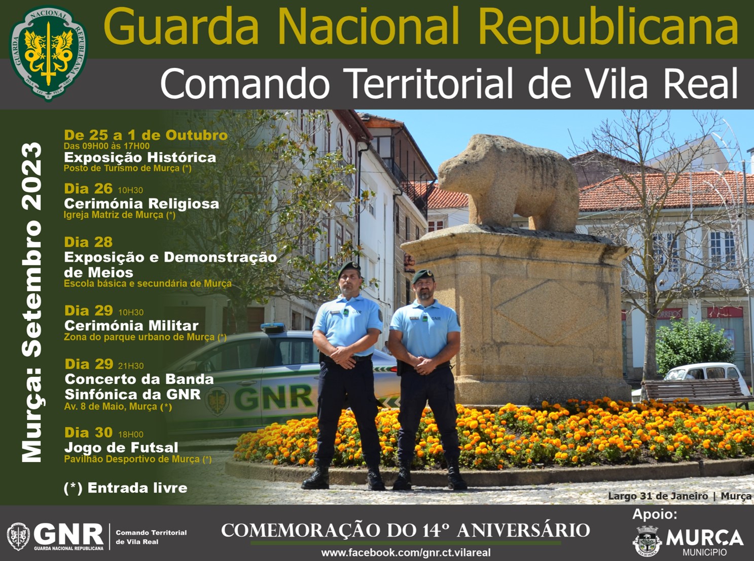 No âmbito das comemorações do 14º aniversário do Comando Territorial da GNR de Vila Real, a partir de hoje, dia 25 de setembro de 2023, até ao dia 1 de outubro de 2023, serão realizados diversos eventos, tendo como palco a Vila de Murça.